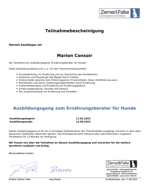Die Ernährung nimmt Einfluss auf die Gesundheit und das Verhalten des Hundes. Deshalb wollte ich mehr wissen und habe eine Ausbildung bei Ziemer & Falke absolviert.